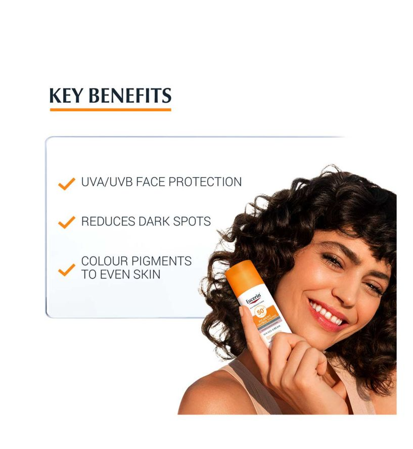Apply a generous amount of Eucerin Sun Pigment Control Sun Tinted Gel-Cream SPF50+ Medium 50ml to the face in the morning routine or at least 20 minutes before sun exposure. Reapply frequently every two hours or after swimming, sweating, or towel drying.